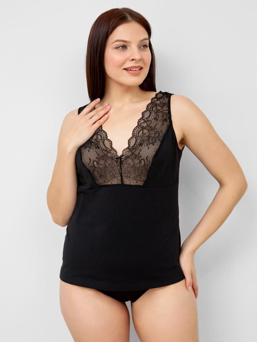 Артикул поставщика: 422513 Состав: 83% хлопок; 11% полиамид; 6% эластан Год: 2023 Страна: Беларусь Тип рукава: без рукавов Покрой: прилегающий фактура материала: кулирное полотно+кружево Тип карманов: без карманов Пол: Женский Вырез горловины: V-образный Российский размер: 58 Рост: 164-170 Обхват груди: 116 Обхват бедер: 122Майка полуприлегающего силуэта с V-образным вырезом. Выполнена из трикотажного полотна кулирного переплетения, а зона декольте – из полупрозрачного кружева. Длина – до середины бедра.