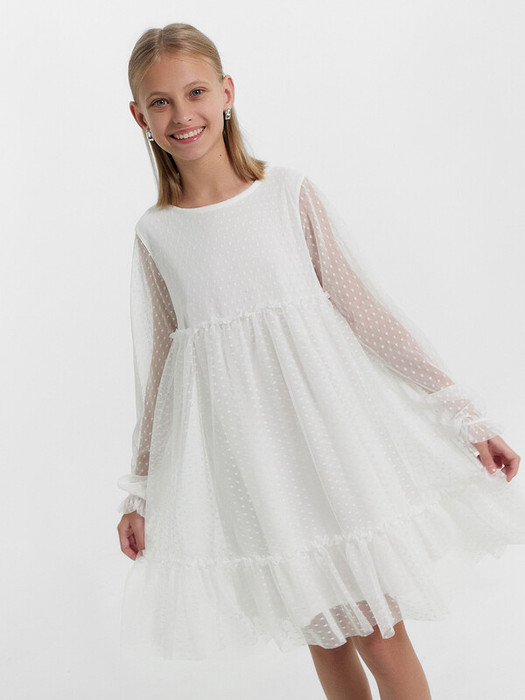 Нарядное платье для девочки из нежной сеточки – идеальный выбор для праздничных мероприятий, утренников и других торжественных случаев. Круглый вырез горловины и длинные рукава придают модели элегантность и утонченность. На спинке находится застежка-пуговица, что добавляет изысканный акцент. Подкладка платья выполнена из нежной хлопковой кулирки, которая обеспечивает комфорт и мягкость на протяжении всего дня. Кулирка – это материал, который дышит, позволяет коже ощущать приятную прохладу и предотвращает раздражение, что особенно важно для детской кожи. Это платье не только красиво, но и функционально, оно подарит вашей малышке ощущение праздника и комфорта. Рекомендуем для создания волшебного и нарядного образа!