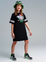Платье для девочек свободного силуэта. Рукава втачные длинные, с отрезными манжетами из рибаны. Плечо слегка спущено. Горловина округлый формы с обтачкой из рибаны. Низ изделия обработан рибаной .