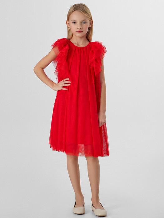 Платье А-силуэта. Спинка и перед цельнокройные. Вырез горловины круглый.  По спинке застежка-капелька на одну петлю WT4-6 и пуговицу d=10mm. Вдоль верхней части проймы рукава расположено три слоя рюш, которые переходят с переда на спинку. Подкладка из трикотажного кулирного полотна.