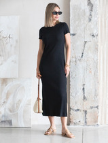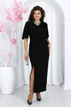 Платье женское прямого силуэта из трикотажного полотна селаник. Горловина круглой формы, с притачным воротником с отрезной стойкой из поплина и застежкой на пуговицу. Плечо слегка спущено, пройма углублена. Рукав втачной, длинный, по низу с отрезной манжетой из селаника. Платье длиной чуть выше колена.
