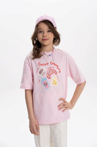 Поло для девочек свободного силуэта с воротником из довяза. На детали переда обработана планка с 3 пуговицами d=10mm, горловина круглой формы. Плечо спущено, пройма слегка углублена. Рукав втачной, короткий.