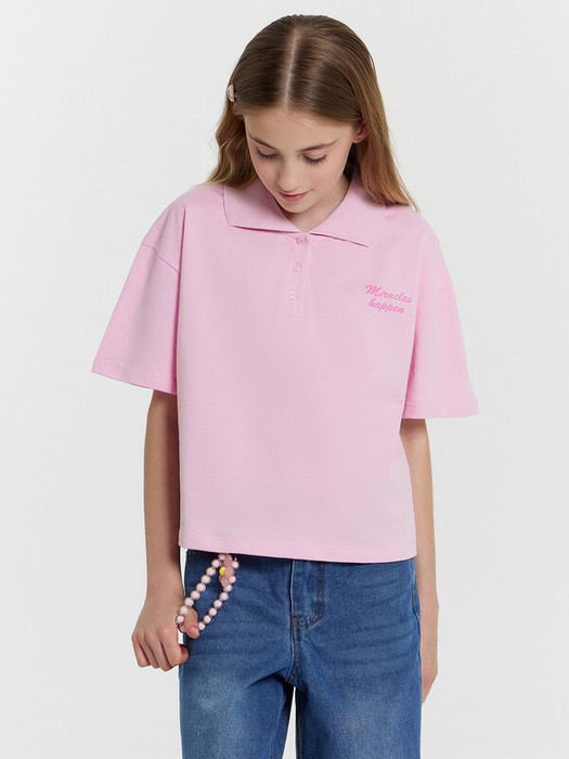 Поло для девочек свободного силуэта с воротником из довяза. На детали переда обработана планка с 3 пуговицами d=10mm, горловина круглой формы. Плечо спущено, пройма слегка углублена. Рукав втачной, короткий.