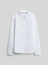 Сорочка верхняя для мальчиков прямого силуэта с воротником. По переду обработана застежка на пуговицы и петли. Диаметр пуговицы 1 см, 4 прокола. Рукава короткие, втачные, слегка спущены. На спине кокетка. Нижние срезы изделия и рукавов обработаны швом в подгибку.