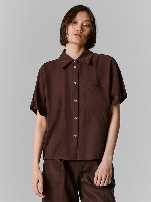 Рубашка свободного силуэта. Горловина обработана классическим воротником, рукава цельнокроеные короткие. Сзади кокетка и заложены складки. Спереди центральная застёжка с петлями и пуговицами. Низ и рукава вподгибку.