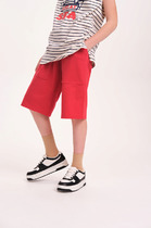 Шорты для девочек. Шорты укороченные, с высокой посадкой. Пояс цельнокроеный с эластичной тесьмой внутри.  Снаружи пробиты петли и втянут шнур 8PXС-2.  В боковых швах кант из трикотажного кулирного полотна. Нижние срезы шорт обработаны швом в подгибку.