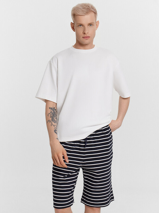 Шорты прямые, свободные. Пояс цельнокроеный с эластичной тесьмой внутри. С внешней стороны пояса пробиты петли и втянута хб тесьма.В боковых швах обработаны карманы, подкладка кармана из основного полотна. Нижние срезы брюк выполнены швом вподгибку на 2-игольной плоскошовной машине.