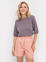 Женские шорты из качественной экокожи. Силуэт свободный, расширенный. Пояс с эластичной тесьмой внутри и рюшей сверху. Есть удобные боковые карманы. Имитация гульфика. Длина шортов – выше колена. Линия талии высокая. Стильные шорты для повседневных образов!