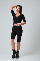 Шорты свободные, короткие. Посадка высокая. Пояс цельнокроеный с эластичной тесьмой внутри (внутр. 40мм, 40RV). В боковых швах обработаны карманы, подкладка из основного полотна. На задней правой половинке накладной карман. Нижние срезы обработаны швом вподгибку.
