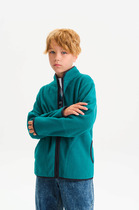 Толстовка прямого силуэта. Горловина округлой формы с воротником стойкой из основного полотна. Рукава втачные длинные. Линия плеча слегка спущена. По низу рукавов отрезные манжеты. Центральная застежка на тесьму молнию. По низу джемпера отрезной пояс из рибаны