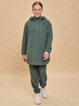 Жакет свободного кроя. Боковые швы к низу перенесены вперед. Круглый вырез горловины. В горловину втачан воротник-стойка из рибаны. Плечо спущено, пройма углубленна. Рукава втачные, длинные. По низу рукавов манжеты из рибаны. В боковых швах карманы . По низу изделия отрезной пояс из рибаны.