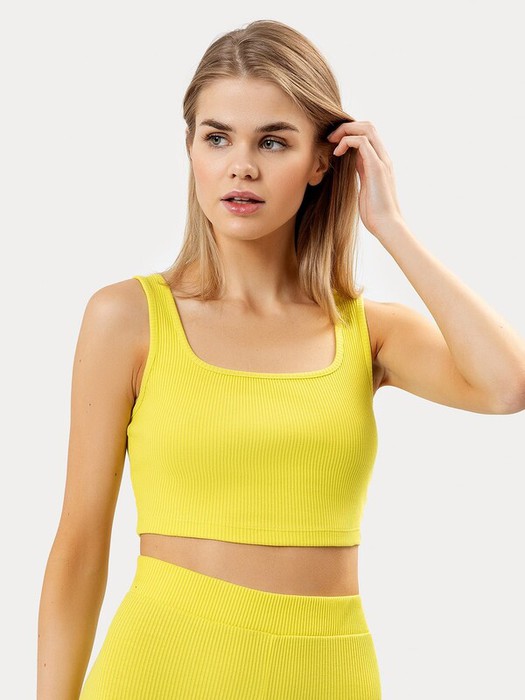 Укороченный облегающий топ на широких бретелях. Выполнен из трикотажной рибаны – в тонкий рубчи. Вырез формы «каре». Рекомендуем!