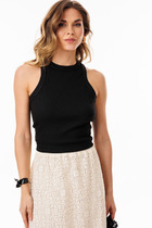 Топ облегающего силуэта с широкими бретелями. Изготовлен из трикотажной кулирки. Вырез горловины – «каре». По нижнему срезу проходит широкий пояс из основного полотна. Бретели и горловина окантованы бейкой из основного полотна.  Рекомендуем!
