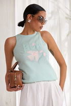 Топ облегающего силуэта, на узких бретелях. Горловина V-образной формы. Топ на подкладке из сетки, с чашками-вкладышами. Горловина и проймы окантованы бейкой из основного полотна. Бейки по проймам переходят в бретель, с регулировкой по длине (кольца и регуляторы). Топ с фигурным подрезом под грудью. В бретелях, окантовке горловин и пройм, по фигурному подрезу, эластичная тесьма. Нижний срез обработан швом вподгибку с эластичной тесьмой внутри