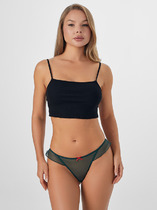 Трусы женские, средняя линия талии, силуэт - бразилиано. Передняя и задняя детали выполнены из рибаны. Верхний срез трусов обработан бейкой поперечной из рибаны, внутри жилка 6мм. Нижние срезы обработаны бейками поперечными из рибаны. Подкладка ластовицы из хлопка, отлетная по верхнему срезу. Посередине бейки по верхнему срезу передней и задней детали застрочена «птичка».