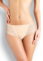 Трусы женские шорты со средней посадкой из рибаны. Передняя деталь цельная. Задняя деталь со средним швом, по ножкам узкое кружево шириной. Нижняя ластовица отлетная по переднему срезу, выполнена из кулирной глади. По талии тесьма эл с зубом настрочена на 4-укольном зигзаге.. Ножки обработаны на плоскошовной машине без эластичной тесьмы.