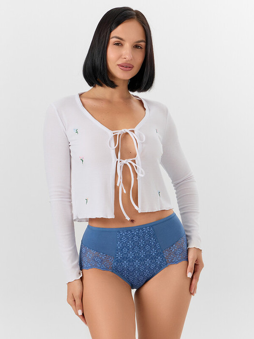Трусы женские макси с высокой  посадкой из кулирного полотна и эластичного кружева. Перед с вертикальным и горизонтальным членением. Передняя центральная деталь из кулирного полотна с наложением наверх эластичного кружева. Ластовица отрезная на подкладке из основного полотна. Срезы ластовицы обработаны эл тесьмой 6 мм (жилка тканая Wt4-6, девсел 13460 W) с наложением на лицевую сторону полотна и с узким верхним застилом в край. Задняя деталь со средним швом и с горизонтальным членением. Вертикальные и горизонтальные швы собраны на ширителе. Верхний срез обработан эластичной тесьмой 10 мм (жилка тканая Wt4-10, девсел 13460 W) с наложением на лицевую сторону полотна и с узким верхним застилом в край.