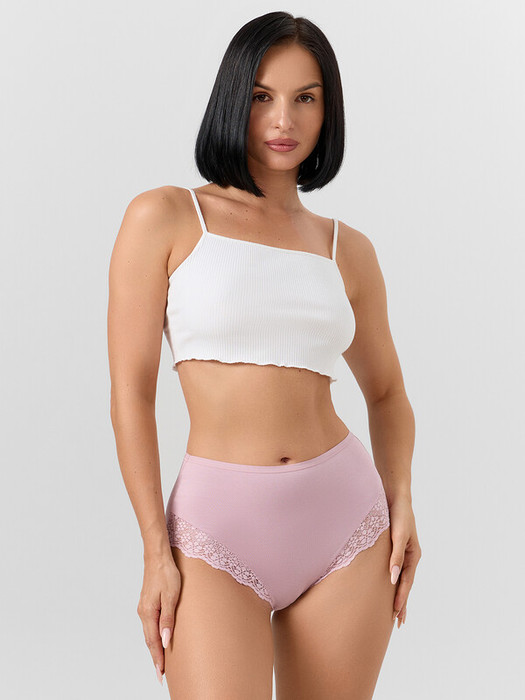 Передняя центральная деталь и задняя выполнены из кулирного полотна. Нижние детали переда из широкого кружева, обработаны ширителем. Трусы с боковыми швами. Верхний срез трусов обработан эл. тесьмой 10мм (жилко й WT4, Девсел арт 13460W) на плоскошовной машине с верхним застилом. Задняя деталь цельнокроеная. Боковые срезы ластовицы и нижние срезы задней детали обработаны эл. тесьмой 6 мм (жилкой WT4, Девсел арт 13460W), настрочена на плоскошовной машине с верхним застилом.