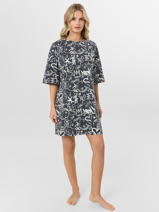 Женская домашняя туника с принтом граффити — это воплощение уюта для вашего отдыха. Модель свободного силуэта из высококачественного хлопка мягко облегает фигуру, не сковывая движений. Принт в стиле граффити добавляет образу яркости и индивидуальности, превращая простую тунику в стильный элемент домашнего гардероба.