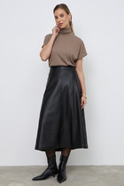 Юбка А-силуэта, длиной миди. По переду заложена складка. По бокам обработаны карманы-хулиганы, подкладка из подкладочной  ткани. Верхний срез обработан обтачкой. Задняя часть с центральным швом и застежкой на молнию (металл №5). На задних половинках застрочены вытачки. Нижний срез подклеен.