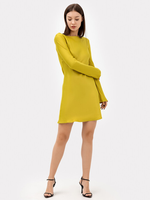 в чистый край. Горловина спинки более вырезана. Рукав втачной длинный, к низу рукав расширяется. Платье длиной выше колена.