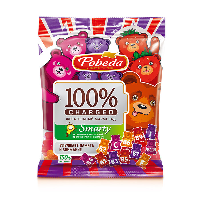 Натуральный жевательный мармелад – это, прежде всего, самое правильное лакомство для взрослых и детей. Пектин и натуральный сок, входящие в состав продукта, улучшают обменные процессы и работу ЖКТ. Мы усилили полезные свойства мармелада с помощью витаминов и микроэлементов, чтобы они поддерживали здоровье и взрослых, и детей. Мармелад Charged «Активный мозг» – мармелад со вкусами апельсина, клубники, черники и малины с витаминным миксом мальтодекстрина, холина, витамина С, ниацина, витамина Е, пантотеновой кислоты, рибофлавина, витамина В6, тиамина, йода, биотина, витамина В12, необходимых для поддержания работы мозга.