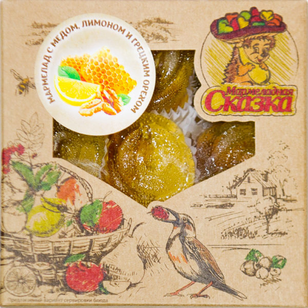 Состав: сахар-песок, патока, лимон, грецкий орех, мед,агент желирующий – пектин, регулятор кислотнойти – кислота лимонная, глазирователь – пчелиный воск, ароматизатор натуральный карамель