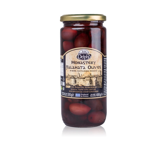 Описание Маслины Каламата с косточкой в рассоле Монастырские DELPHI 480г Состав: маслины (59,4%), вода, морская соль, винный уксус. Масса нетто: 480 г. Упаковка: стеклянная банка. Страна производитель: Греция.