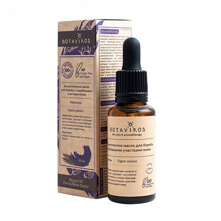 Косметический уход: эфирное масло, содержащееся в надземной части цветущих растений - бархатцев мелких, незаменимо для направленного восстанавливающего ухода за сухой огрубевшей кожей. Эффективно размягчает мозоли и натоптыши, улучшает состояние кожи на локтях и стопах, благодаря усиленному питанию и регенерирующему воздействию.