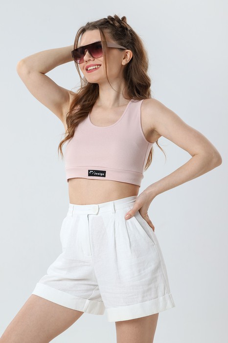 Кроп-топ – из полотна «рибана» без рукавов, с горловиной овальной формы, обработанной окантовкой из основного материала и притачным поясом по низу. В центре пояса настрочен декоративный элемент.