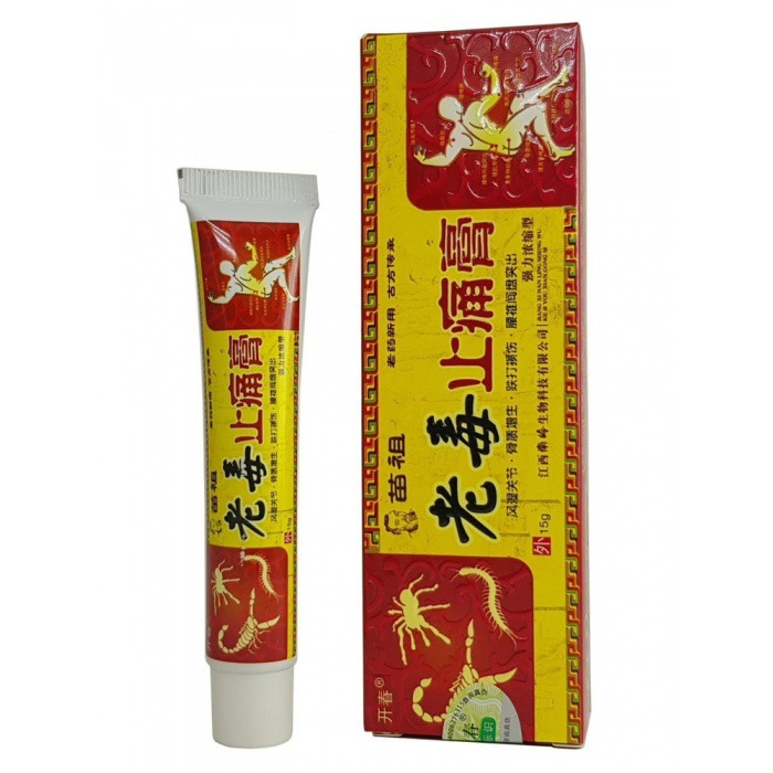 Состав мази: падубовое масло, фисташка-лентикус, рвотный корень, лазурник растопыренный, черный муравей, сухой имбирь, растолченные старые (материнские) корнеклубни аконита китайского, мята полевая, камфора, борнеол, хлоргексидина ацетат и др.