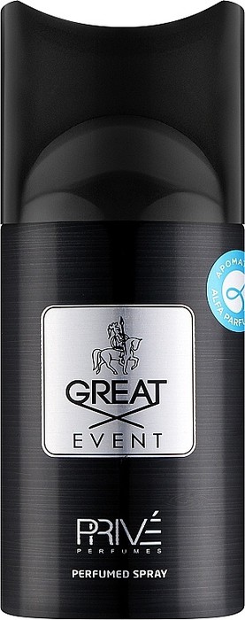 Парфюмированный спрей-дезодорант Prive Great event позволит окружить себя приятным и ненавязчивым ароматом. В жаркий сезон парфюмированный дезодорант можно использовать вместо духов, не боясь перегрузки интенсивностью аромата.