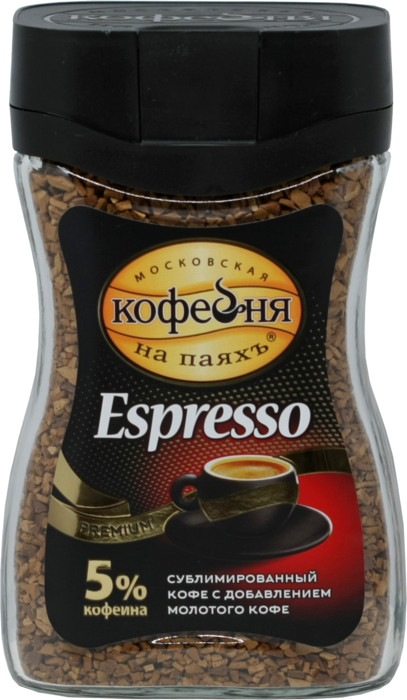 Кофе натуральный растворимый сублимированный с добавлением натурального обжаренного молотого кофе.Кофе для настоящих ценителей яркого эспрессо по-итальянски. Создан из элитных сортов высокогорной арабики. Инновационная технология позволила соединить молотый и растворимый кофе, наделив Espresso превсходным вкусом и ароматом свежеобжаренного кофе в сочетании с быстротой приготовления.