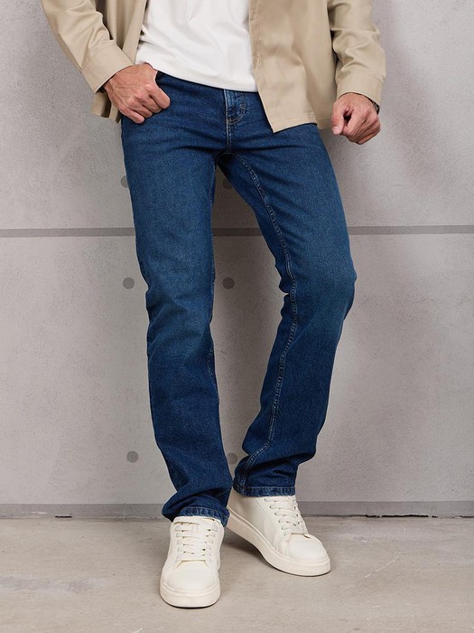 Мужские модные джинсы с пятью карманами. Посадка Slim fit (облегающие по бедру), средняя талия спереди, высокая сзади.. Застежка на молнии. Немного зауженные к низу. Выполнены из слабоэластичной ткани denim comfort stretch. Классическая средняя стирка с потёртостями и "усами" спереди и потёртостями сзади.