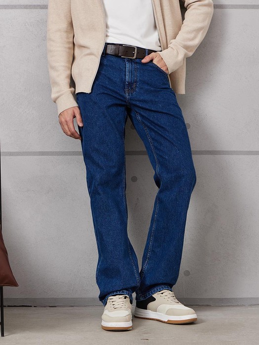 Мужские классические джинсы с пятью карманами. Посадка Comfort fit (свободные по бедру), высокая талия, широкие в колене и по низу. Застежка на молнии. Выполнены из традиционной хлопковой ткани denim. Темная стирка с камнями (stone wash).
