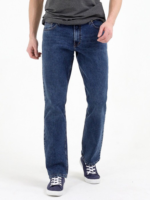 Мужские классические джинсы с пятью карманами. Посадка Regular fit (полуоблегающие по бедру), средняя высота талии. Застежка на молнии. Немного зауженные к низу. Выполнены из слабоэластичной ткани denim comfort stretch. Средняя стирка со слабовыраженными потёртостями и "усами" спереди и потёртостями сзади. Параметры указаны для размера 32. Длина внутреннего шва 83 см.