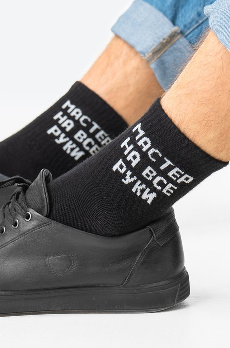 Черные мужские носки с прикольной надписью Мастер на все руки точно поднимут настроение и разбавят повседневные будни! Демисезонная модель средней длины выполнена из смесового трикотажа: хлопок с добавлением эластана для лучшей посадки по ноге.