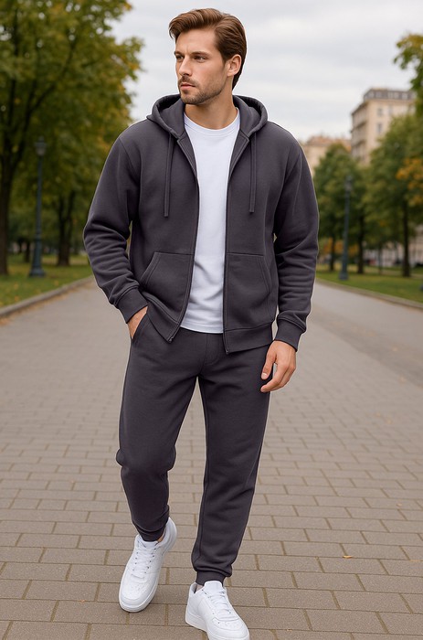 Спортивный мужской костюм выполнен из плотного футера трехнитки. Худи с застежкой на молнию, глубокий капюшон и мягкие манжеты делают костюм графитового цвета для мужчин невероятно уютным и практичным.