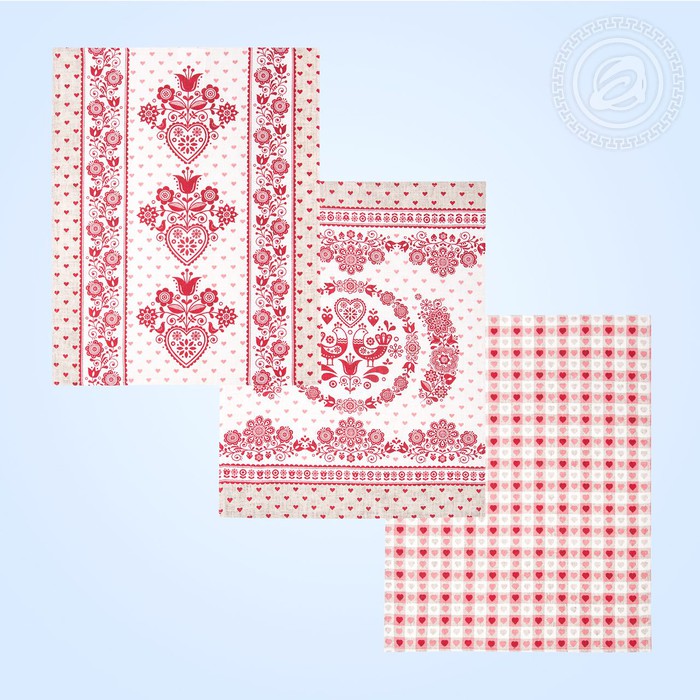 Каждая хозяйка хотела бы видеть на своей кухне, помимо с любовью приготовленных разнообразных блюд, еще и деталь декора, которая сочетала бы в себе необходимость и красоту. Полотенца с новым рисунком под названием «Вятка» замечательно вписываются в любой интерьер. Нарисованные красным цветом различные фигурки: курочки, цветочки, сердечки, цепочки из орнаментов и отдельные детали, на белом фоне смотрятся торжественно. Ткань из рогожки порадует прочностью, а изображение привлечет внимание гостей.