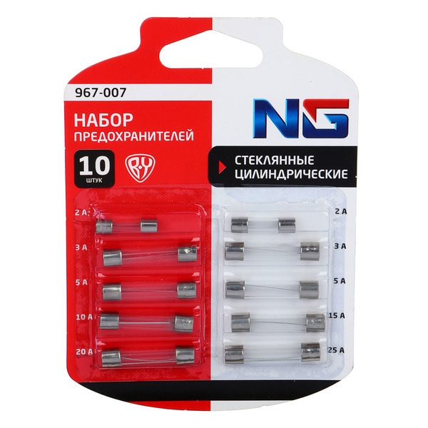 Набор плавких цилиндрических стеклянных предохранителей NG стандартного типа состоит из 10 предохранителей номиналом от 2 до 25 А. Предназначены для защиты силовой цепи автомобиля от перегрузок. Прозрачный корпус позволяет увидеть целостность плавкого элемента. Надежные и долговечные. Простая установка и демонтаж.