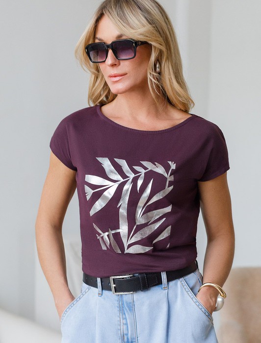Состав: 92%Хлопок 8%ПУ Плотность: 150 Г/м2Футболка цвета бургунди идеально подходит для вечеринки и создания яркого образа. Оригинальный блестящий принт из устойчивой фольги в виде серебристых листиков придает изделию шикарный вид, который привлечет внимание на любом мероприятии. Модель с вырезом лодочка и цельнокроеным коротким рукавом обеспечивает свободу движений и комфорт в носке. Такой фасон изделия подходит на большие размеры, гармонично сидит на фигуре и помогает создать легкий акцент на достоинствах. Аккуратный вырез лодочка красиво подчеркивает шею и делает образ элегантным, сохраняя актуальность для разных случаев — от рабочих встреч до вечерних прогулок и праздничных мероприятий.
