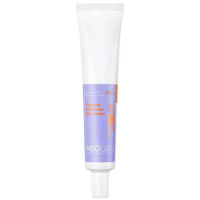 Крем для век Neogen Dermalogy V.Biome Advanced Eye Cream борется с морщинами и потерей упругости в области вокруг глаз, разглаживает, подтягивает, уплотняет, смягчает и интенсивно питает, уменьшает тёмные круги и отёчность. Питательное средство транспортирует омолаживающие и увлажняющие активы глубоко в роговой слой с помощью липосом: стимулирует синтез коллагена и эластина, укрепляет каркас кожи, придаёт естественное сияние, предотвращает испарение влаги, не оставляет липкой плёнки, быстро впитывается. Крем прошёл клинические испытания: продукт не вызывает раздражения. Формула содержит комплекс из 10 пептидов, в том числе аргирелин (10,000 ppm), который оказывает действие миорелаксанта, расслабляя мышцы лица, за счёт чего разглаживает мимические морщинки и подтягивает. Пептид Syn-Coll® (глицерин, вода, трипептид-5) — эффективно активирует продукцию белка коллагена и препятствует его распаду, повышает тургор, разглаживает рельеф.Пробиотики (Lactobacillus Ferment Lysate) в составе нормализуют состояние микрофлоры, снижают окислительный процесс, замедляют старение клеток, повышают местный иммунитет.Подходит для всех типов кожи.Способ применения: нанесите крем на область вокруг глаз после очищения, тонизирования и использования сыворотки. При желании используйте продукт на сухих участках, нуждающихся в антивозрастном уходе (межбровье, носогубные складки).Объём: 35 мл