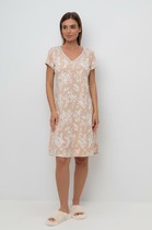 Сорочка женская из трикотажного полотна «кулирка» слегка расширенная книзу, без рукавов. Кружевные детали кокетки на полочке образуют V-ный вырез горловины. На нижней части полочки по шву притачивания кружевной кокетки заложены симметричные складки, проймы окантованы основным материалом.