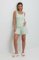 Сорочка молодежная из гладкокрашенного вискозного полотна, слегка расширенная книзу, с горловиной овальной формы, без рукавов на бретелях. Горловина и проймы окантованы основным материалом, детали бретелей выкроены из кружева, низ изделия отделан кружевом.