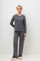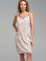 Сорочка женская из трикотажного полотна «кулирка» с набивным рисунком, расширенная книзу, без рукавов, с расширенной, углубленной горловиной овальной формы и притачной кокеткой по переду. Срезы пройм и горловины, а также шов притачивания кокетки, обработаны фасонной эластичной тесьмой с кружевным краем. Низ изделия обработан узкой обметочной строчкой.