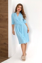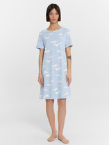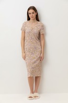 Сорочка женская из трикотажного полотна «кулирка» с набивным рисунком, расширенная книзу, без рукавов, с расширенной, углубленной горловиной овальной формы и притачной кокеткой по переду. Срезы пройм и горловины, а также шов притачивания кокетки, обработаны фасонной эластичной тесьмой с кружевным краем. Низ изделия обработан узкой обметочной строчкой.