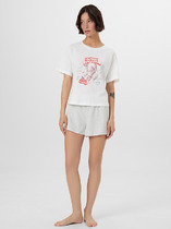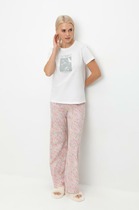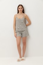 Сорочка женская из трикотажного полотна «кулирка» с набивным рисунком, расширенная книзу, без рукавов, с расширенной, углубленной горловиной овальной формы и притачной кокеткой по переду. Срезы пройм и горловины, а также шов притачивания кокетки, обработаны фасонной эластичной тесьмой с кружевным краем. Низ изделия обработан узкой обметочной строчкой.
