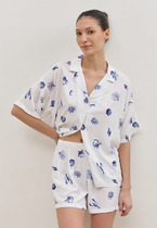Сорочка женская из трикотажного полотна «кулирка» с набивным рисунком, расширенная книзу, без рукавов, с расширенной, углубленной горловиной овальной формы и притачной кокеткой по переду. Срезы пройм и горловины, а также шов притачивания кокетки, обработаны фасонной эластичной тесьмой с кружевным краем. Низ изделия обработан узкой обметочной строчкой.
