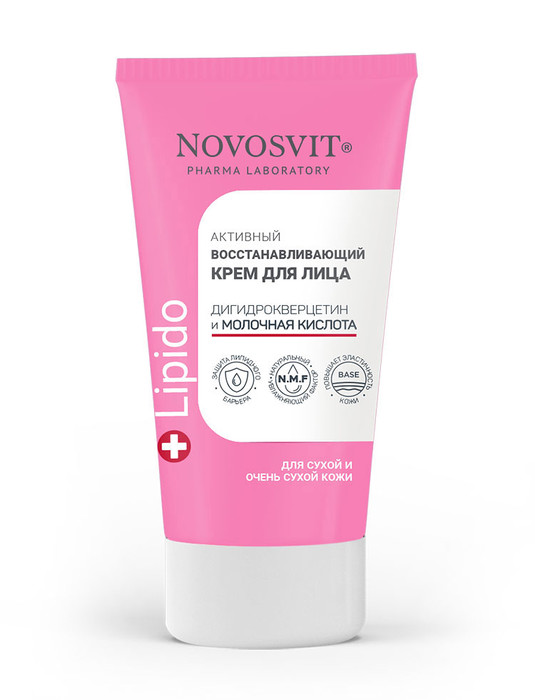 Активный восстанавливающий крем для лица содержит мощный комплекс активных компонентов: масла в сочетании с Витамином Е, Д-пантенол, молочную кислоту (NMF) и антиоксидант дигидрокверцетин, который способствует восстановлению и укреплению липидного барьера кожи.