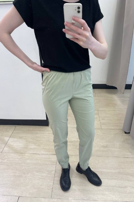 Брюки из костюмной ткани, чуть зауженные книзу. На передней части брюк имитация гульфика, декоративные подрезы и карманы. Пояс с эластичной резиной. Низ брюк на резинке.